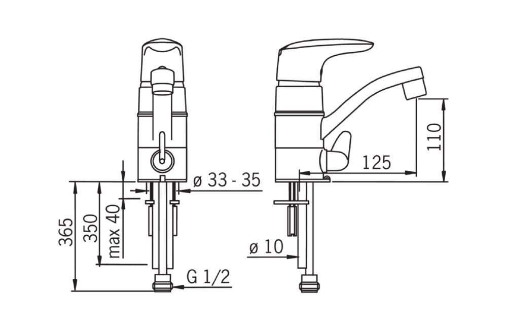Смеситель для умывальника с клапаном для посудомоечной машины, с поворотным изливом - клапан (подвод холодной воды) Угол поворота излива 100° (заводская установка), может быть изменен. Двухкомпонентная прочная рукоятка оснащена эко-кнопкой для ограничения температуры и расхода воды. При нажатии эко-кнопки расход можно увеличить.