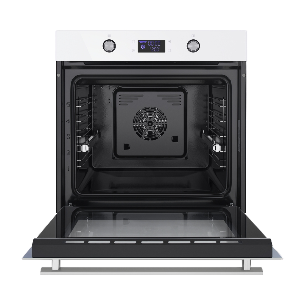 Фронтальная панель духовки выполнена из высококачественного жаропрочного стекла белого цвета. Ручка дверцы и ручки управления, сделанные из матированной нержавеющей стали черного цвета, не нагреваются в процессе готовки.