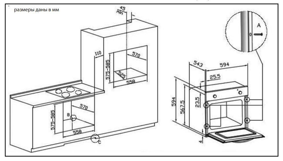Размеры ниши для встраивания, ВхШхГ см: 58,5x55,8x57