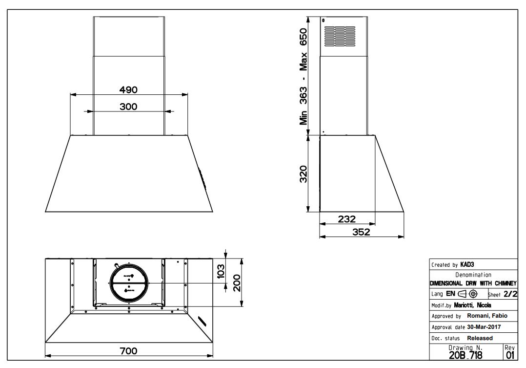 Faber CHLOE EV8P CI A70 — настенная вытяжка производительностью 700 м 3/ч. Модель оборудована кнопочной панелью управления, посредством которой можно с легкостью выбрать и установить скорость всасывания, а также активировать интенсивный режим или встроенную подсветку. Для удобства эксплуатации предусмотрена система индикации, сообщающая о необходимости очистки жироулавливающего фильтра.
