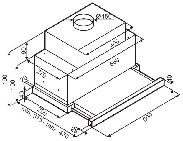 Встраиваемая вытяжка из высококлассной стали, передняя планка отделана тонированным стеклом, встраивается в шкаф над поверхностью плиты. Благодаря выдвижному козырьку она эффективно собирает загрязненный воздух над плитой. Дизайн великолепно впи