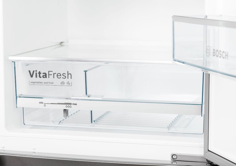 Холодильники Bosch VitaFresh оснащены ярким и равномерным светодиодным освещением холодильной камеры. Боковой и потолочный источники света расположены таким образом, что не перекрываются продуктами, поэтому содержимое полок и зоны свежести отлично просматривается.