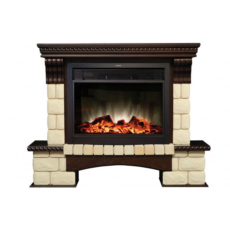 Обрамление в стиле "Кантри" изготовлено из искусственного камня и шпонированного МДФ. Камень цвета античный орех. Очаг обладает звуковым эффектом потрескивания дров. Очень качественный и надежный очаг будет радовать вас не один год. Нагреватель спрятан в верхней части очага и обеспечивает обогрев в холодную погоду.