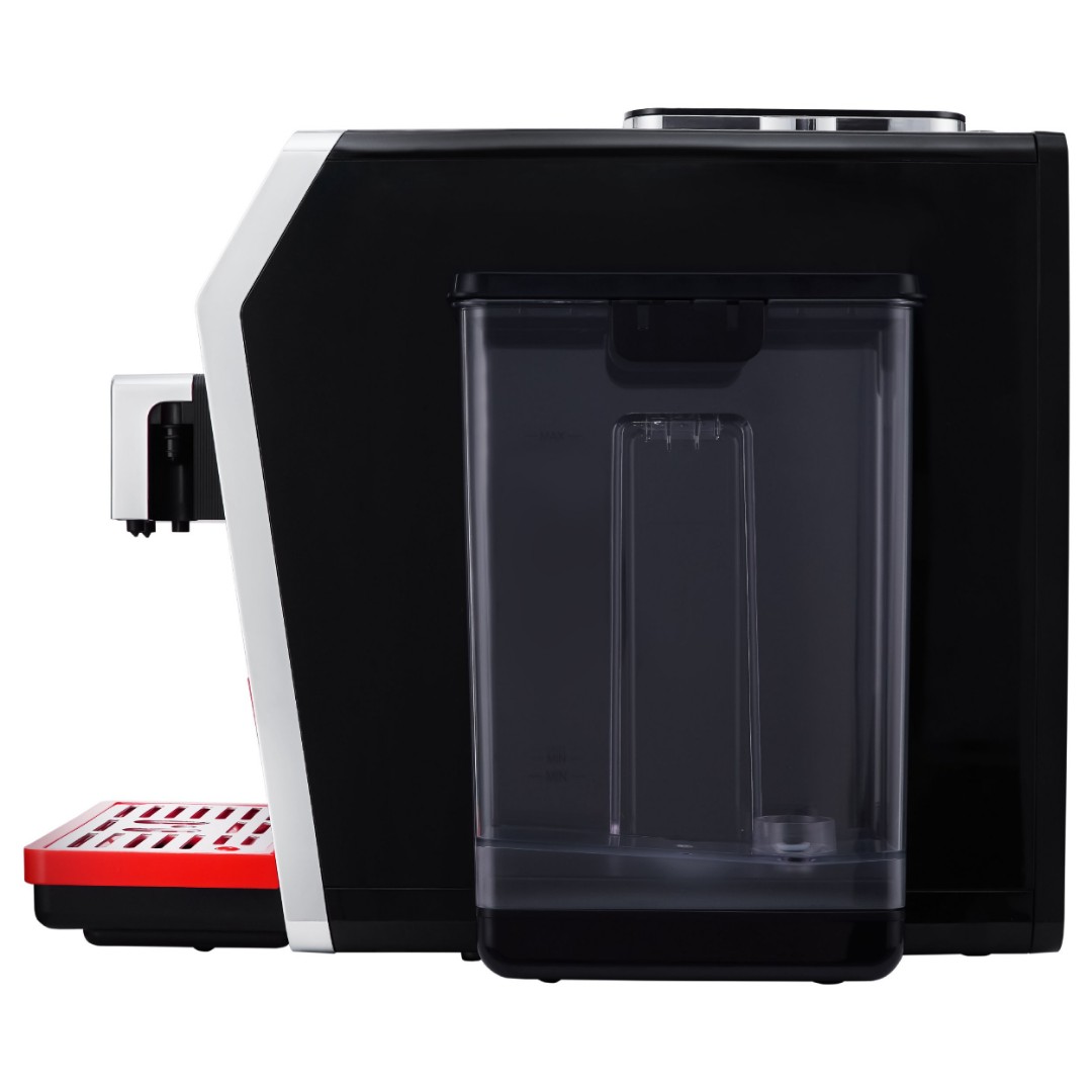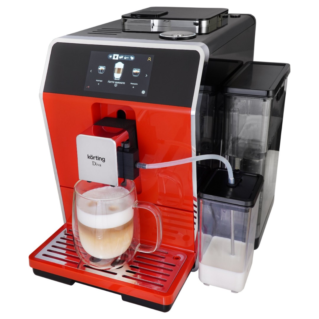 Кофемашина KACM 2005 Diva, выполненная в красном цвете, имеет 35 автопрограмм для приготовления напитков. Кроме того, она предлагает свыше двухсот индивидуальных настроек с возможностью их сохранения. Выбор напитка и настройки, включая подбор объема кофе и молочной пены, осуществляется на цветном сенсорном дисплее. Автоматический капучинатор позволяет готовить напитки с молоком нажатием одной кнопки. Он работает в паре с независимым контейнером для молока обёъемом 500 мл, который можно хранить в холодильнике. Разборная конструкция значительно упрощает обслуживание и продлевает срок службы прибора. Для дополнительного удобства кофемашиной можно управлять как при помощи сенсорного дисплея, так и при помощи дискового джойстика. Регулировка высоты дозатора для чашки также производится вручную, что позволяет готовить напитки в посуде с разными размерами.