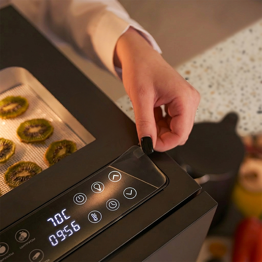 Дегидратор оснащён сенсорной панелью, которая значительно упрощает процесс настройки. Никаких механических рычагов и лишних кнопок — всё управление сосредоточено в одном месте.