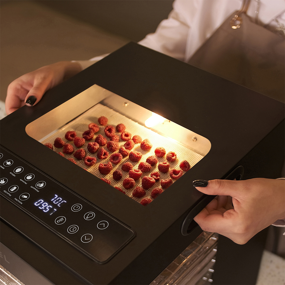 Чёрный корпус из нержавеющей стали, устойчивый к нагреву, влаге и коррозии, выглядит лаконично и современно, легко вписывается в интерьер кухни или мастерской. Внутри установлено 12 поддонов из нержавеющей стали с зазором 25 мм — этого достаточно, чтобы удобно размещать ломтики фруктов, травы или мясные полоски.
