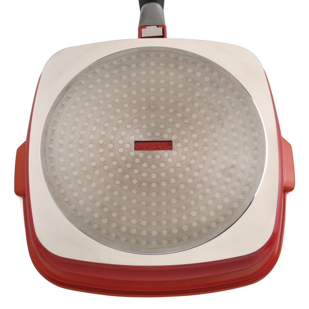 Рельефное дно не позволяет пище кипеть в своих собственных жирах и подрумянивает типичными для гриля полосками.
