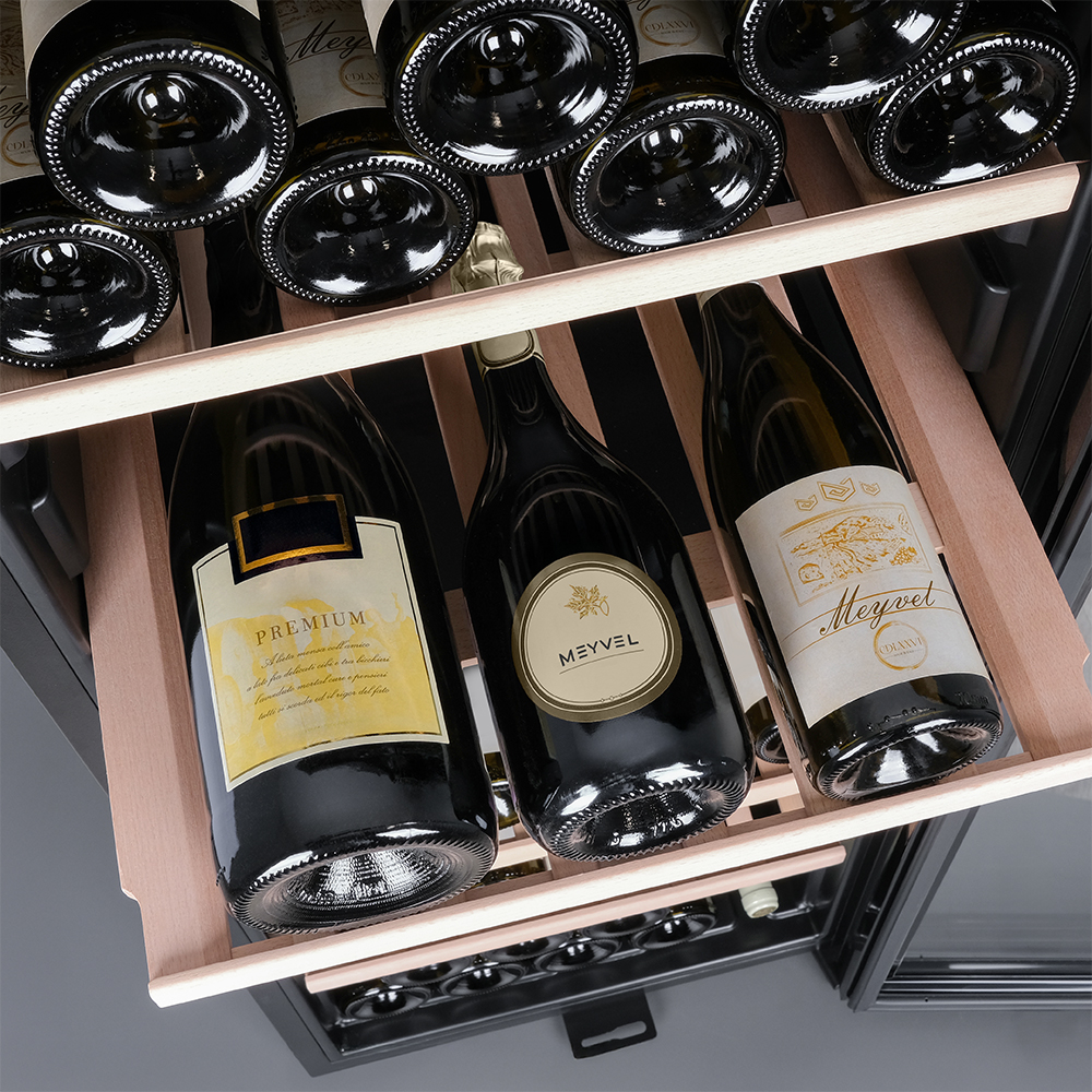 Модель оснащена четырьмя полками из дерева, что не только выглядит стильно, но и способствует правильной циркуляции воздуха внутри шкафа. Дополнительно можно установить до 6 полок, а также приобрести демонстрационную полку и полку для фужеров. Двойное стекло с УФ-фильтром надежно защищает вино от вредного воздействия света, что сохраняет его уникальный вкус и аромат.