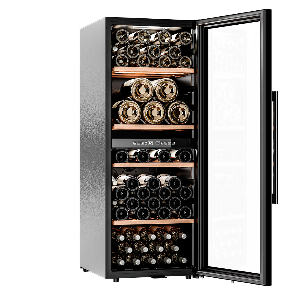 Модель оснащена четырьмя полками из дерева, что не только выглядит стильно, но и способствует правильной циркуляции воздуха внутри шкафа. Дополнительно можно установить до 5 полок, а также приобрести демонстрационную полку и полку для фужеров. Двойное стекло с УФ-фильтром надежно защищает вино от вредного воздействия света, что сохраняет его уникальный вкус и аромат.